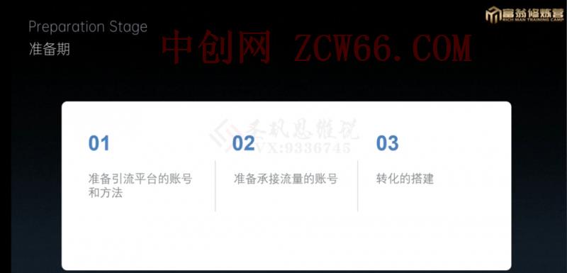 我们富翁训练营主要的核心思想就是从来不打没有准备的仗,如果说你什么都没有准备好的话,你就去操作这个项目那么你一定失败。这个三个小步骤里面准备期要准备,准备引流平台的账号和方法,准备承接流量的账号,准备转化的搭建